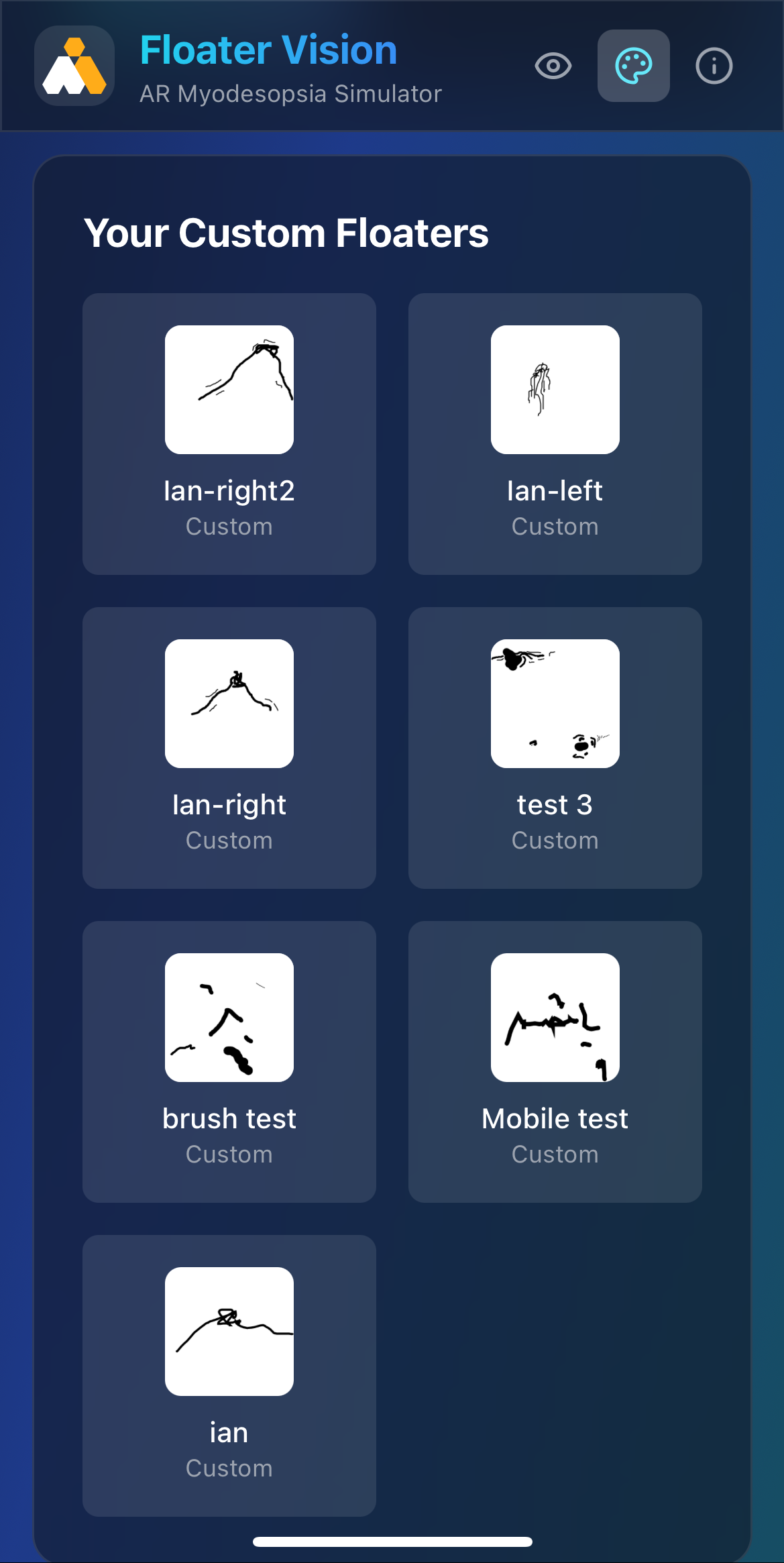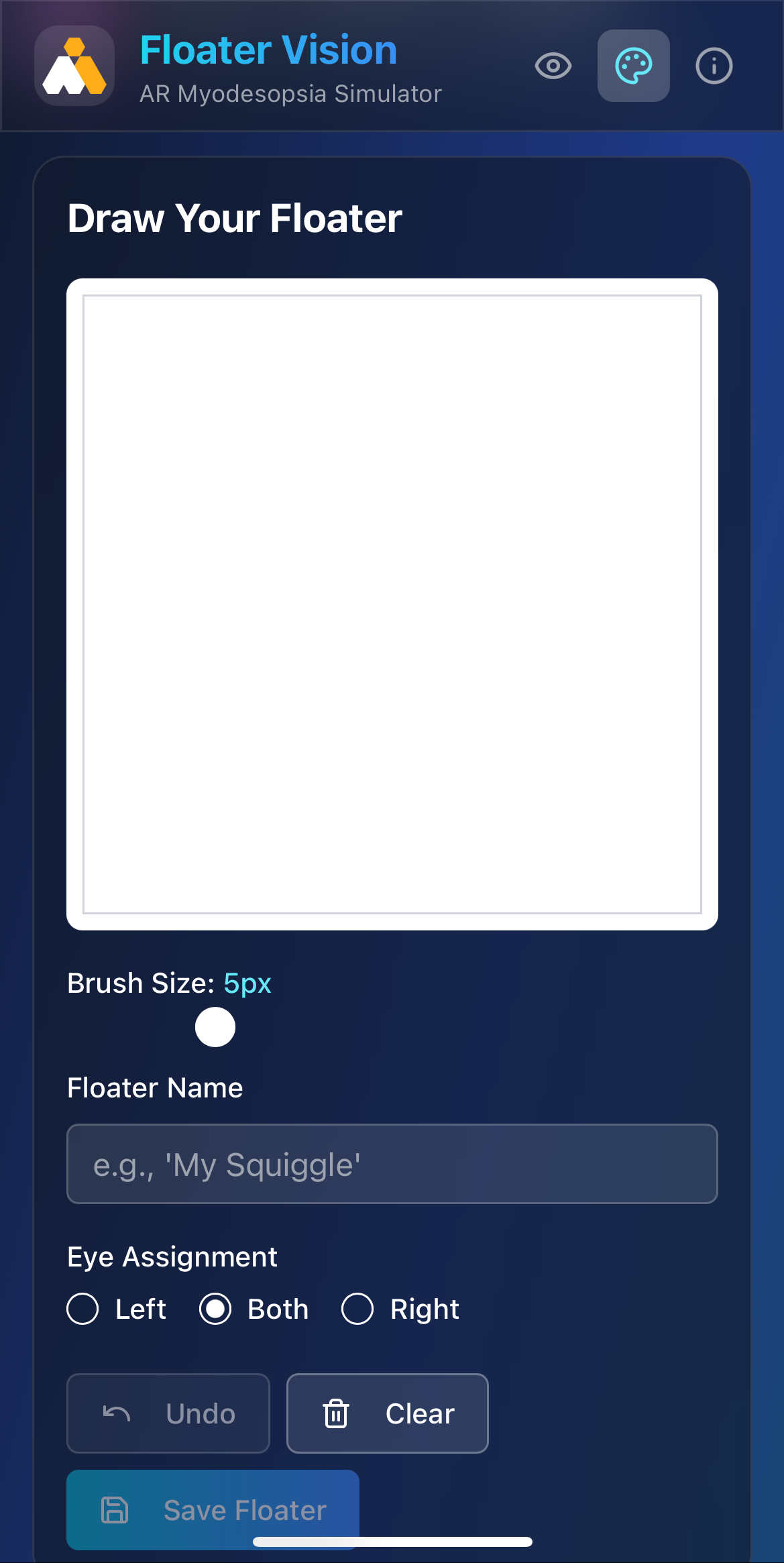 Goforaloop developed a responsive AR app for mobile devices that overlays dynamic floaters in your cameras field-of-view. By pairing the app with device motion tracking, the floaters move in response to the device, simulating the experience of eye movements for those with myodesopsia. Goforaloop developed the app interface, logic, and UX experience. The app was developed with customizable settings that allow the user to adjust the characteristics of the floaters to match their experience. It also includes the ability for the patient to draw their own floaters as a way of recreating their symptoms for others to see. An education section provides useful information about the condition and techniques for reducing their impact.
